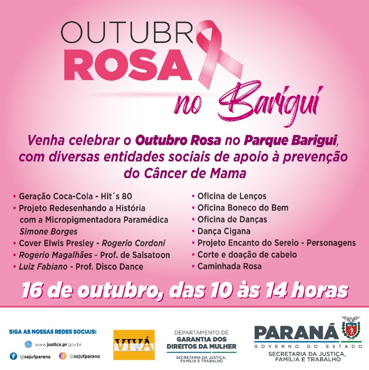 Caminhadas, oficinas de arte e música, corte e doação de cabelo entre outras atividades devem marcar o próximo sábado, dia 16 de outubro. O evento "Outubro Rosa no Barigui" faz parte das ações promovidas pela Secretaria de Justiça , Família e Trabalho (SEJUF) e apoiado pelo Departamento de Garantias dos Direitos da Mulher (DGDM) em prol da conscientização e prevenção de combate ao câncer de mama.