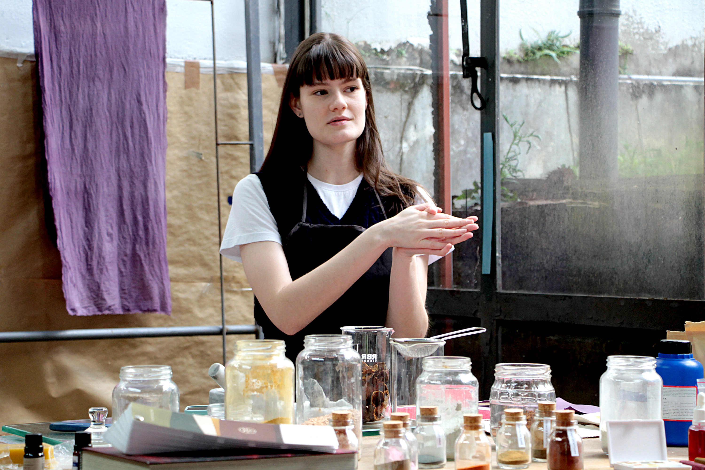 A proposta aprofundou sua pesquisa sobre pigmentos naturais, explorando a criação de novas cores e o tingimento de tecidos a partir de elementos vegetais e minerais. Como parte das atividades, a artista ministrou duas oficinas voltadas ao público jovem, promovendo vivências práticas sobre a extração de pigmentos e a relação entre arte e natureza.