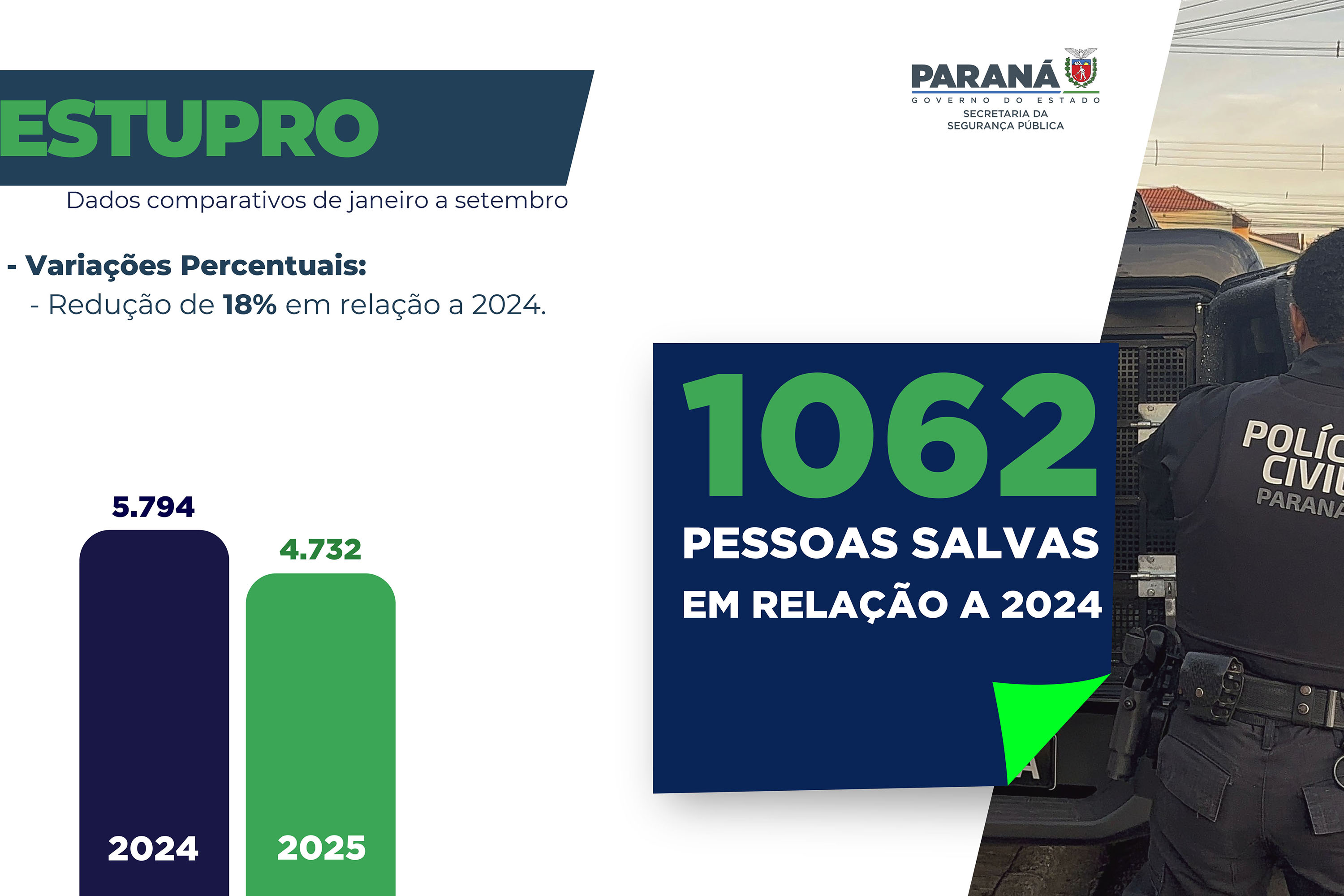O Paraná registrou queda de 10% nos casos de feminicídio entre janeiro e setembro de 2025, em comparação com o mesmo período do ano anterior. Foram 64 ocorrências neste ano, contra 71 em 2024. A Capital teve redução de 13% nos casos de feminicídio no período. Nos 76 municípios onde o Programa Mulher Segura foi implementado inicialmente, a redução foi ainda mais expressiva, de 25% (de 56 para 42 casos), segundo levantamento da Secretaria da Segurança Pública. No mesmo período, os estupros diminuíram 18%, o que representa mais de mil mulheres.
