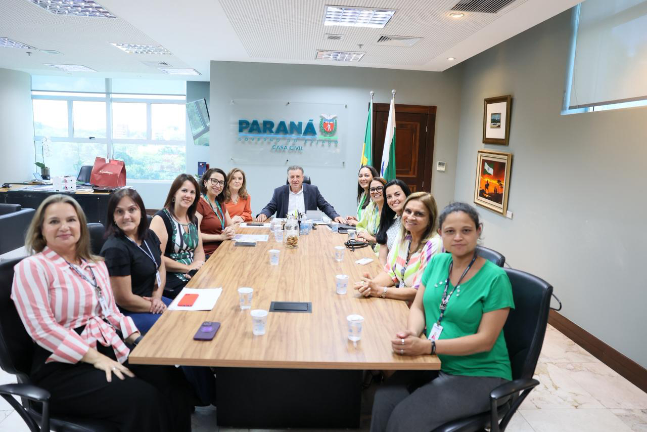 PRESENÇAS – O ato de assinatura também contou com a presença de lideranças femininas da Casa Civil, que acompanham e fortalecem a implementação das ações voltadas à equidade de gênero e à prevenção da violência contra a mulher. Participaram do encontro Adriana Mulek, Barbara Oliveira Trindade, Luciana Carla da Silva Azevedo, Rosicleia Massaneiro, Marines Veronica Prado, Ana Claudia Freire, Sheila Betina Radloff da Silveira e Ludyane Aparecida de Jesus Esqurski.