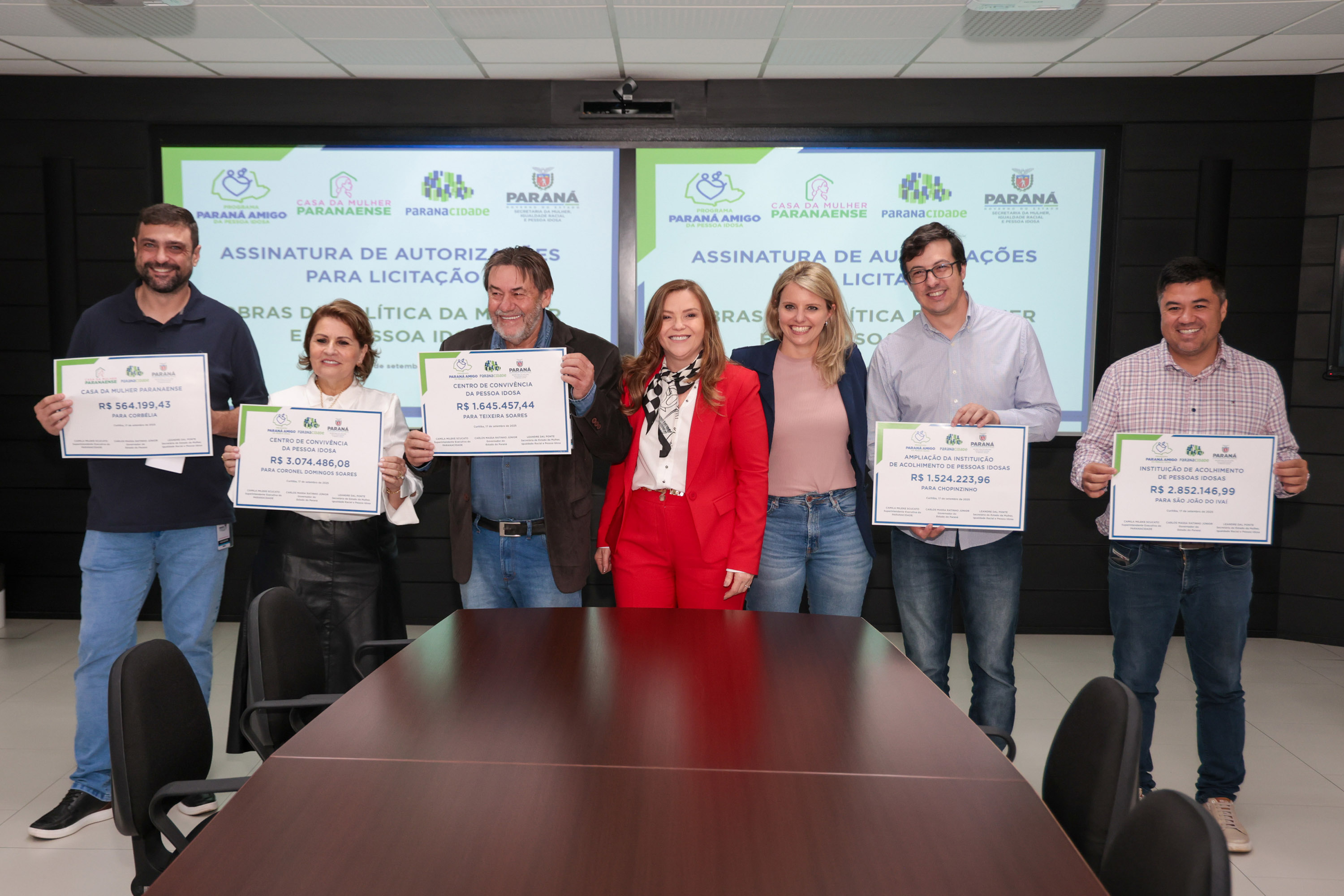 O Governo do Paraná autorizou R$ 13,2 milhões em licitações para a execução de obras voltadas ao fortalecimento das políticas públicas para mulheres e pessoas idosas em sete municípios do Estado. Entre as autorizações, está a implantação da primeira Casa da Mulher Paranaense, em Corbélia. As demais autorizações incluem construções, ampliações e reformas que vão ampliar a rede de acolhimento, proteção e convivência das pessoas idosas. As autorizações foram entregues em um evento no Palácio das Araucárias, nesta quarta-feira (17).